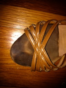 What you can see (and discern): This dancer likes to wear her shoes snug, with her toes right on the front edge of the shoes, kissing the floor. She also likes to wear a strappy style to more easily conform to the shape of her foot (notice the stretching in the straps). From the side view of the front part of the shoes, you can see that even the straps of the shoes show floor-wear. This is true on both the inside and outside of the foot.