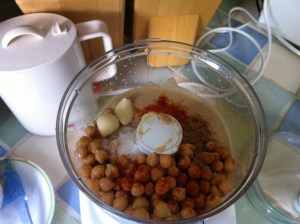 I dumped the garbanzo beans into the food processor, plus 3/4 cup of tahini, 3/4 cup olive oil, juice of one lemon (I used lemon juice concentrate because I’d forgotten to buy a lemon), and the following spices to taste: cumin, red pepper, 2 cloves of garlic, and salt.