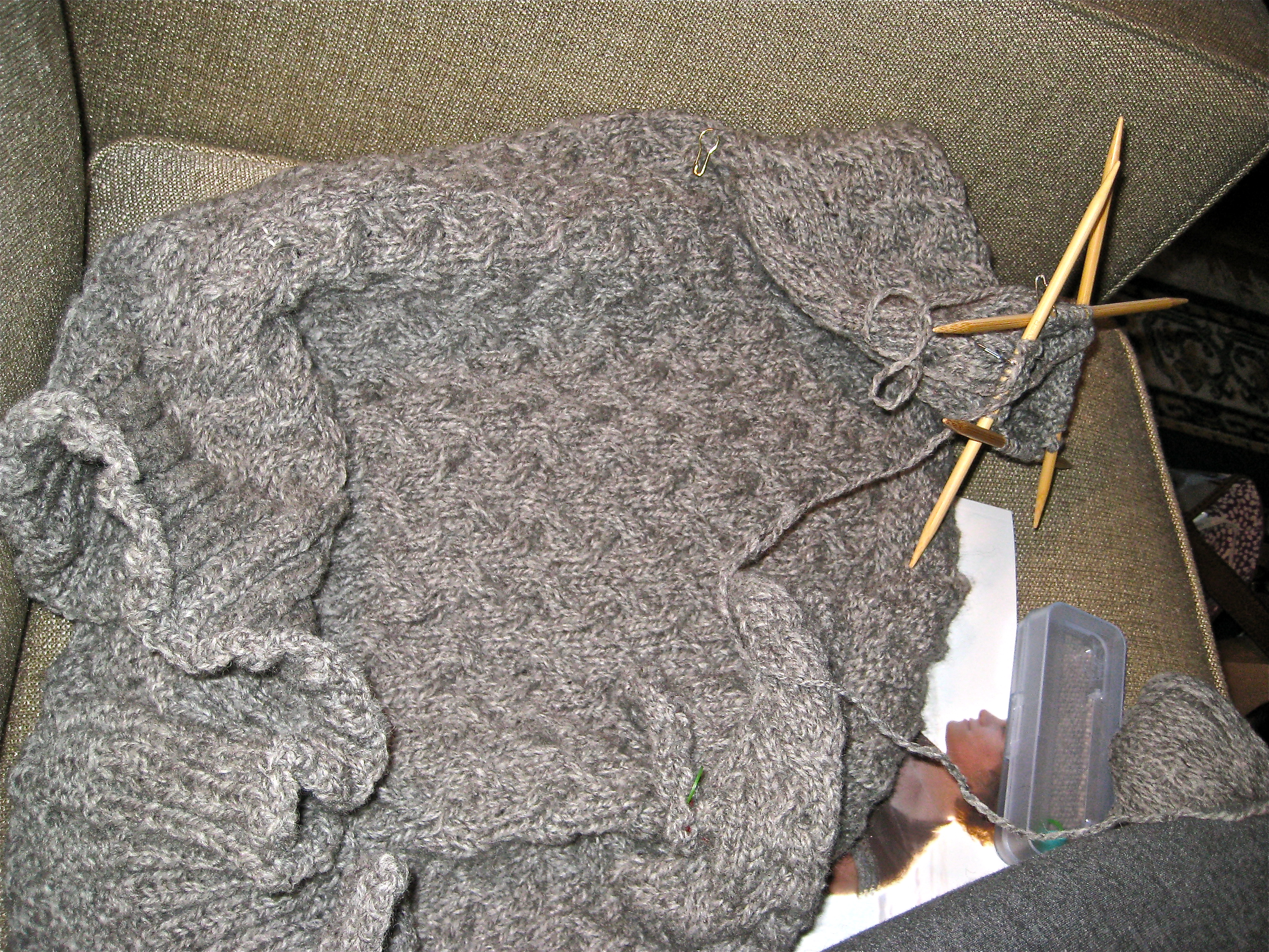 I’m speeding along on my Rocky Coast cardigan. I bought the yarn two weeks ago and I’ve already finished the main body and now I’m working on the first sleeve.