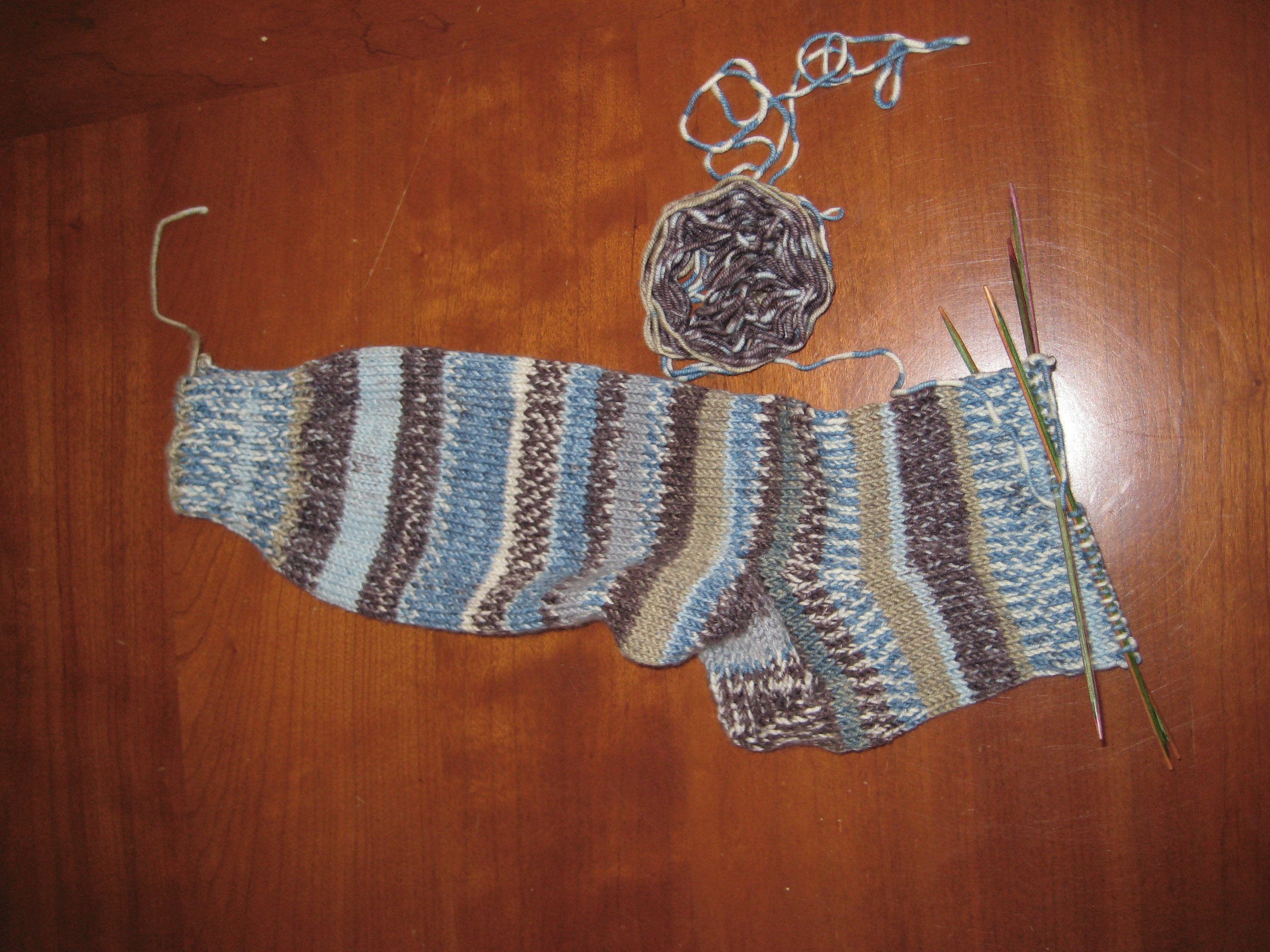 • Well, I’m out of yarn. They were these little balls and I sort of assumed that each one was one sock’s worth based on weight. I’ve got one more little ball and technically I could continue where this one leaves off, but then I would have 1.5 socks, which isn’t much use.