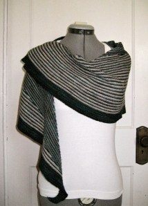 I knitted the lace weight variation of this shawl and have been wearing it constantly for the last six months. I used three colors of Madelinetosh lace weight merino in Calligraphy, Charcoal, and Nebula.