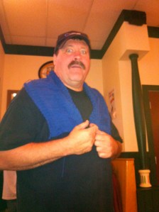 I bound off the shawl while at Pints & Purls. Our group has a standing agreement with our regular server whereby he will model any project finished while at the bar. He gamely agreed to model mine.