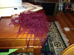 The treadles gave me trouble for a while. It’s very difficult to pay attention to your feet, hands and yarn at the same time. I was continually snapping the yarn and letting the weasel off the leash. When that happened, the weasel was very hard to harness again. I ended up with a pile of discarded yarn scraps that looked like this: