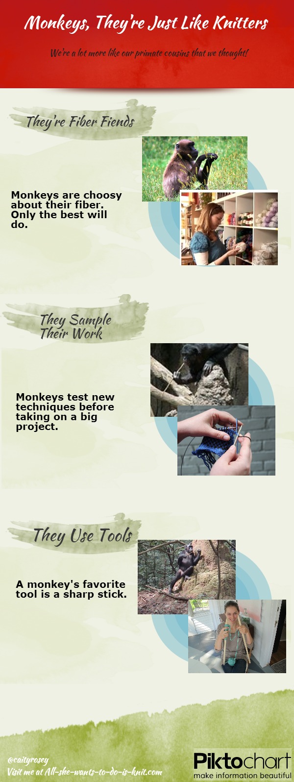 I chose “Monkey” as my “house” in the Monday post. Today, I’m still stuck on the topic of monkeys. Monkeys and knitting. So I cobbled together the attached infographic. Enjoy!