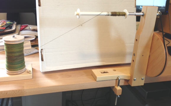 Then I set the bobbin winder up on the desk, impaled a plastic bobbin on the winder, and commenced a-windin’.
