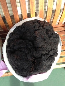 Mom and I returned after judging to pick out a couple of fleeces to take home. She snagged a gray Corriedale-Romney cross. I managed to claim a black Corriedale (it may fade to a cinnamon color after washing). I was very pleased with my find as it was first place in its category.
