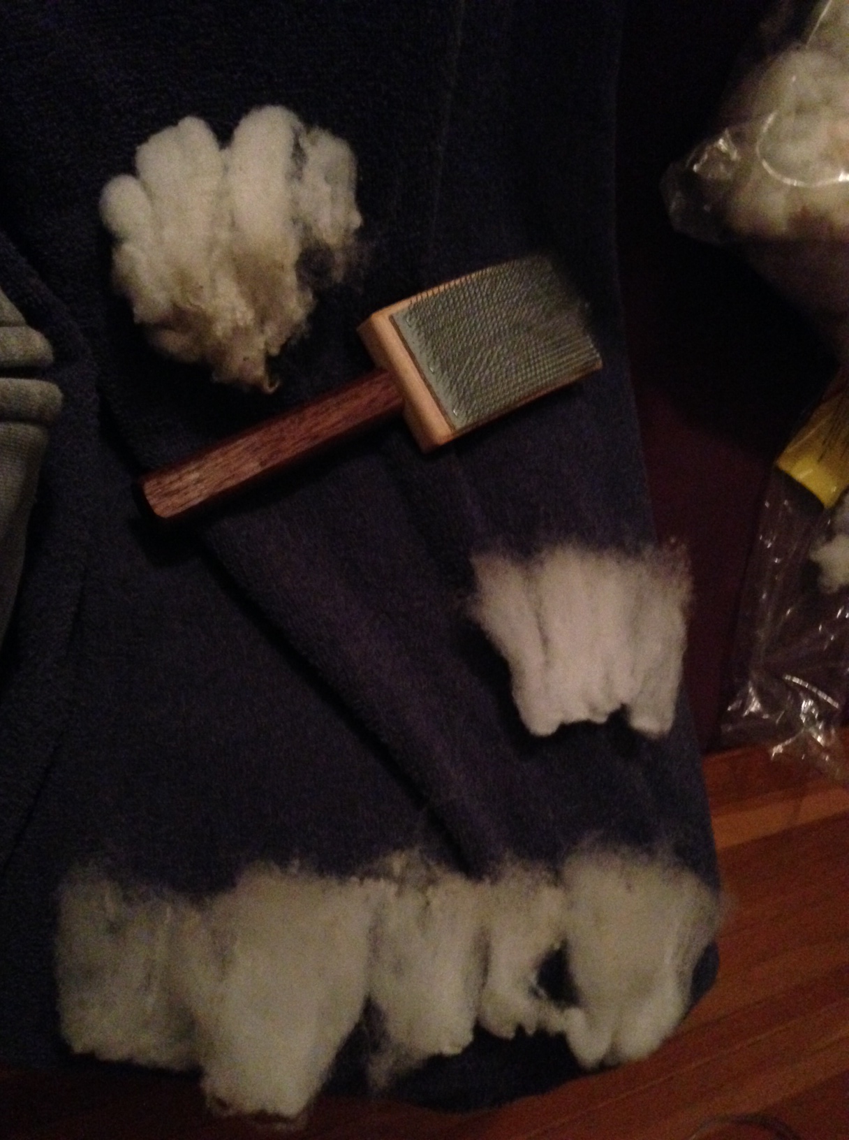 A large bundle of fluffy rolags now rests next to the couch by the wheel. Ready to spin.