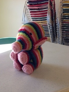 Susan brought dozens of adorable knitted toys to share with us, including a set of ingenious reversible toys. Those “topsy turvy” toys remind me of the Popples I loved in he ’80s. There was a cat that reversed into a mouse and a bunch of others I can’t recall. But I laughed at them all so they must have been good.