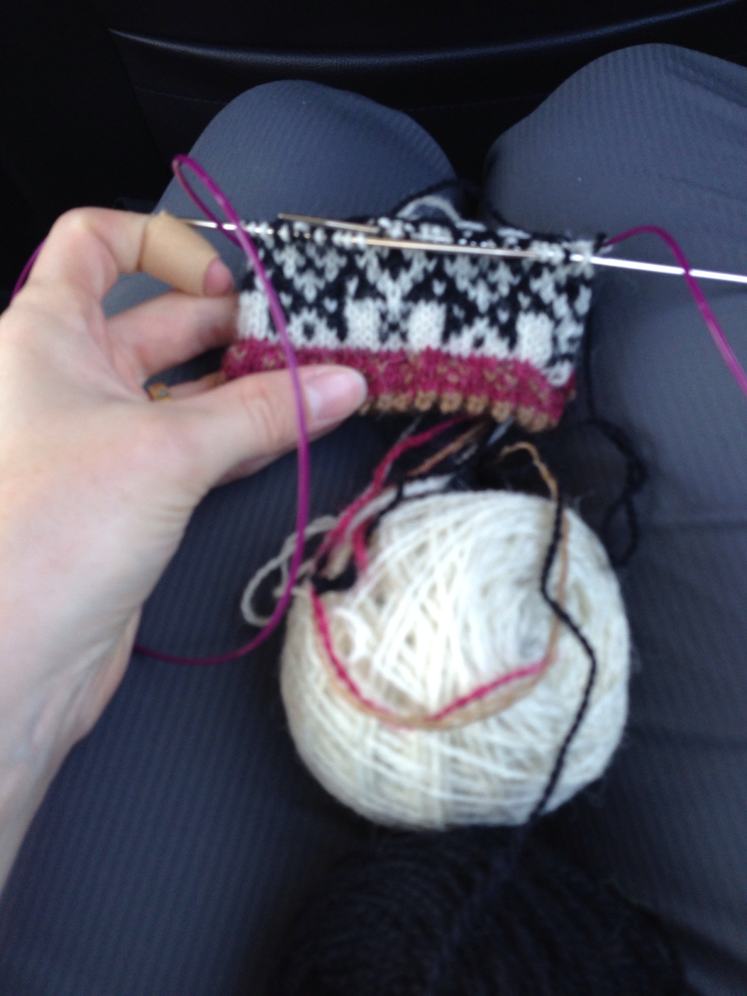 I started these Selbu-Baaa-Ter mittens to keep me entertained on the long drive to GenCon. Pattern by Mary Scott Huff.