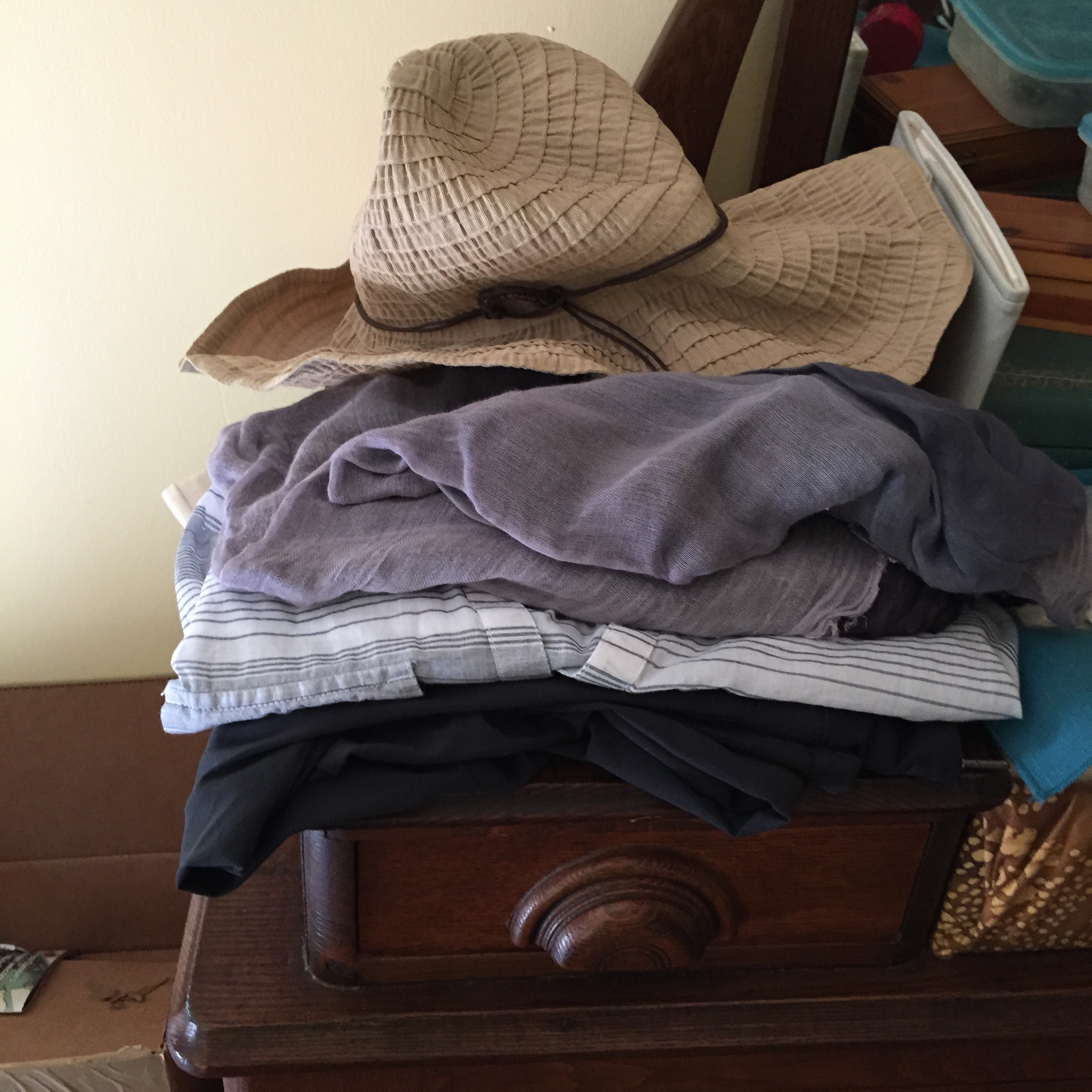 Pen and pencil. My treasured yurbud headphones, which let me hear what’s going on around me while listening. Good for urban settings. Other earbuds for the plane that block noise a little better, because it’s super annoying when you can’t hear your audiobook, even with the sound turned all the way up. And earplugs to combat pressure changes.Three pars of light shoes or sandals. One may still be jettisoned before we leave. I can’t quite decide which.Besides the knitting/spinning I’m bringing: Kindle, folding fan, wallet (duh), journal, neck pouch style money belt, compact, lip balm, sun glasses. This all goes in the day pack to keep me entertained on the plane.The top layer of stuff in the main compartment of my bag. A compression bag full of wicking undershirts, undies, bras, pajamas, etc… The aforementioned extra yarn and fiber. A toiletries bag with all the usual. A purse, because I don’t want to always have to carry backpack. Two packable shopping bags. Another waist moneybelt option, because I can’t decide which one to use. I hate them both in different ways.A packing folder containing the bulk of my clothing: 3 tops, 1 cardigan, 1 sundress, 2 pair capris, 1 skirt, 1 pair dressier black jeansAnd a plane outfit. Light weight long-sleeved buttondown, undershirt, scarf, light weight long pants. And a squishable but still stylish sun hat, which I may just stuff into my bag.All of it fits, with room to spare. Not a lot, but some. Husband is packing a couple of extra compression sacks just in case we need them later.