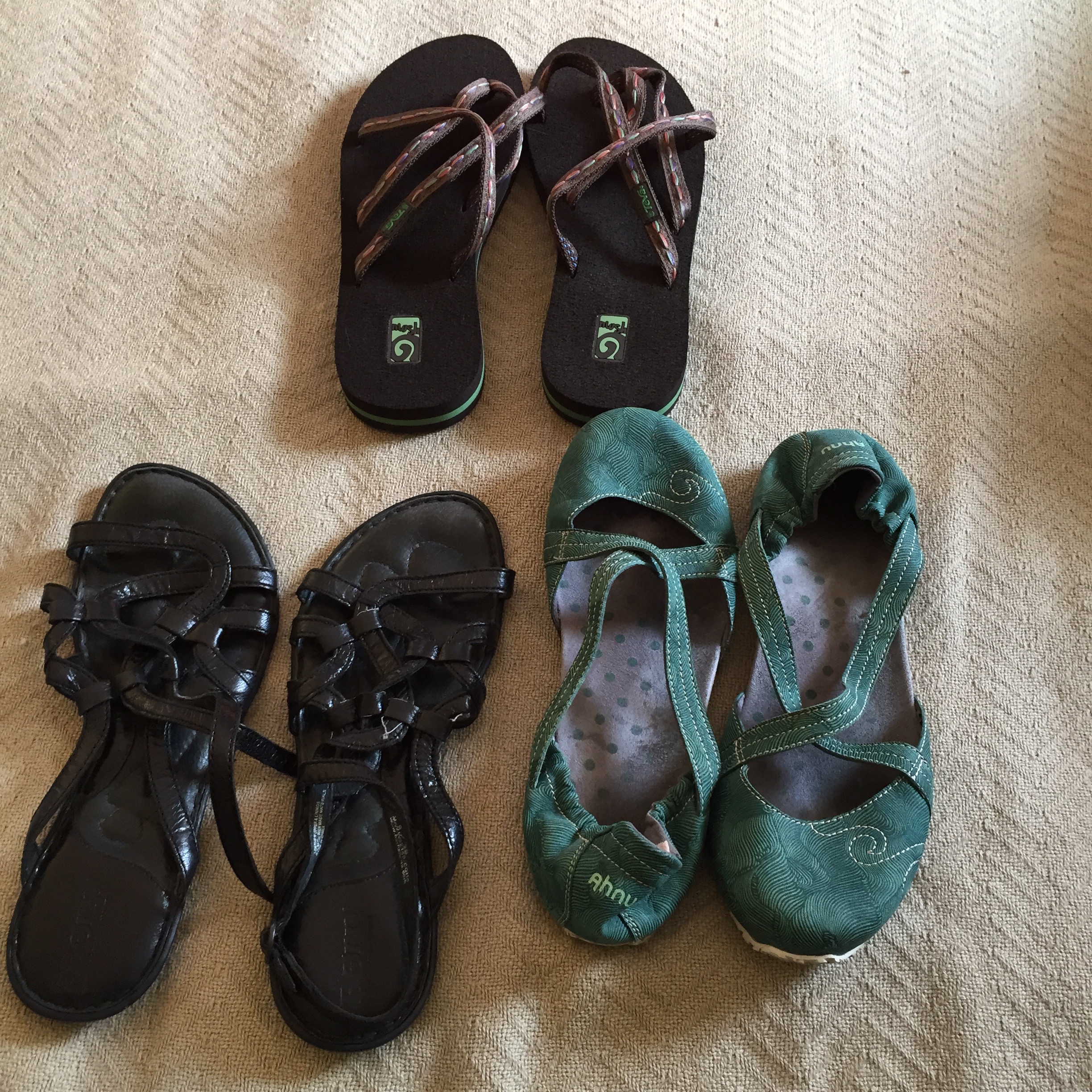 Jettison the flip-flops. I have found that one pair of open sandals (in my case bright pink Merrell walking sandals) can double up for the purposes of flip-flops, whereas it’s not so the other way around.
