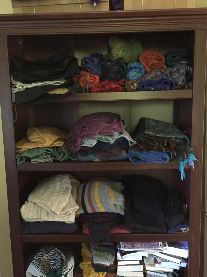 It’s 48 degrees F today with a high of 63. You know what that means. It’s sweater weather. I just spent a happy few minutes unpacking and shelving all the wooly goodness. Sweaters. Cardigans. Shawls. Cowls. (The mittens and hats are stored elsewhere.)